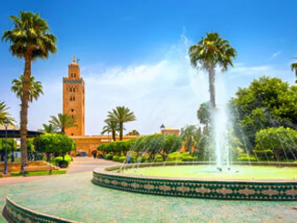 The city of Marrakech is in the middle of a lush oasis. Our guided morning walk will introduce you to this fascinating Imperial City. We'll visit the Bahia Palace, with its gardens and harem quarters, see Ben Yussef Madrassa and the Koutoubia Tower. In the afternoon, we'll have free time to shop for local crafts in the souks or wander through Jemaa El Fna Square, famous for its market stalls, food vendors, performers, snake charmers, acrobats, storytellers, and musicians. In the evening, enjoy a Moroccan dinner in one of the best local restaurants in the city.