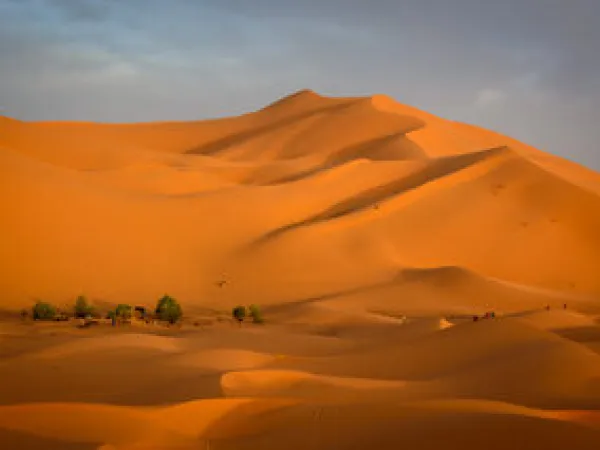 Spend the morning Xploring the Erg (sand sea) of the Sahara Desert, traveling in the shadow of the giant dunes to fully appreciate their height, stopping at nomad desert villages, enjoying mint tea with the locals, and learning about the significance of the mint tea ritual. The entire Sahara Desert was once underwater as evidenced by the abundant snail and squid fossils found here, with an opportunity to search for these relics that date back several millions of years. Afterwards, head to the magical village of Khamlia, renowned for its Gnawa musicians. During lunch of the local specialty of Medfouna or “Berber Pizza”, we'll learn about Gnawa music, and its spiritual, sub-Saharan origins and we'll be treated to a private concert. In the afternoon, you can relax by the hotel's swimming pool, then, just before sunset, we'll travel by camels onto the dunes to our Berber desert camp for the night. After dinner, we'll enjoy traditional Berber music around the campfire, before falling asleep under the starry skies of the desert, in a comfortable Berber tent!